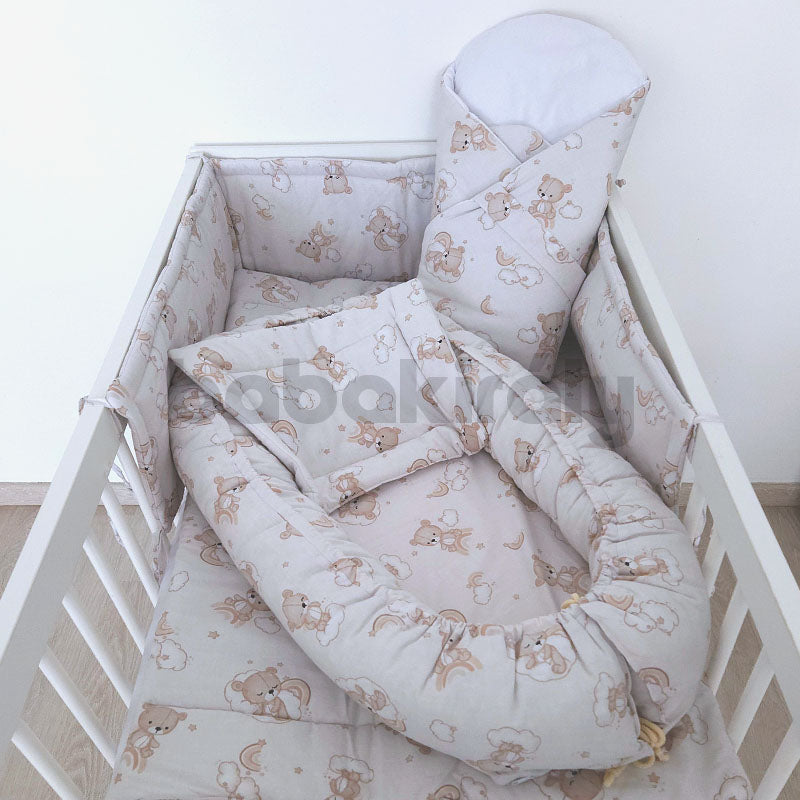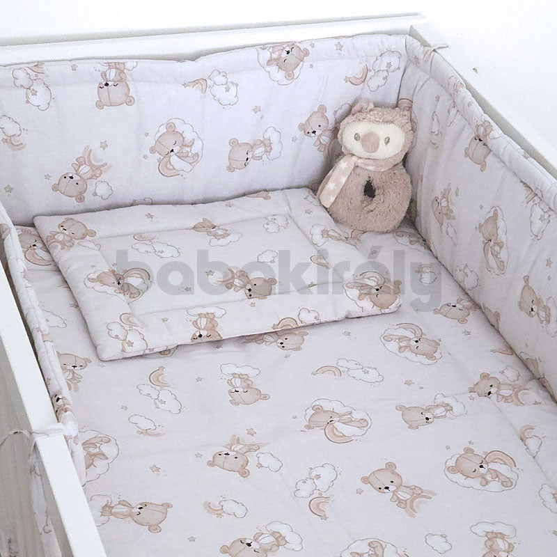 Ágynemű: Három részes (takaró + párna + fejvédő) mosható ágynemű szett, színes vidám mintákkal, az anyukák és a kisbabák legnagyobb örömére. Újszülött kortól ajánljuk. Méreteiből adódóan bármilyen babaágyban jól használható. A fejvédő óvja a már fejét emelgetni tudó babát az ággyal való ütközéstől, mely kötők segítségével erősíthető a kiságyhoz.