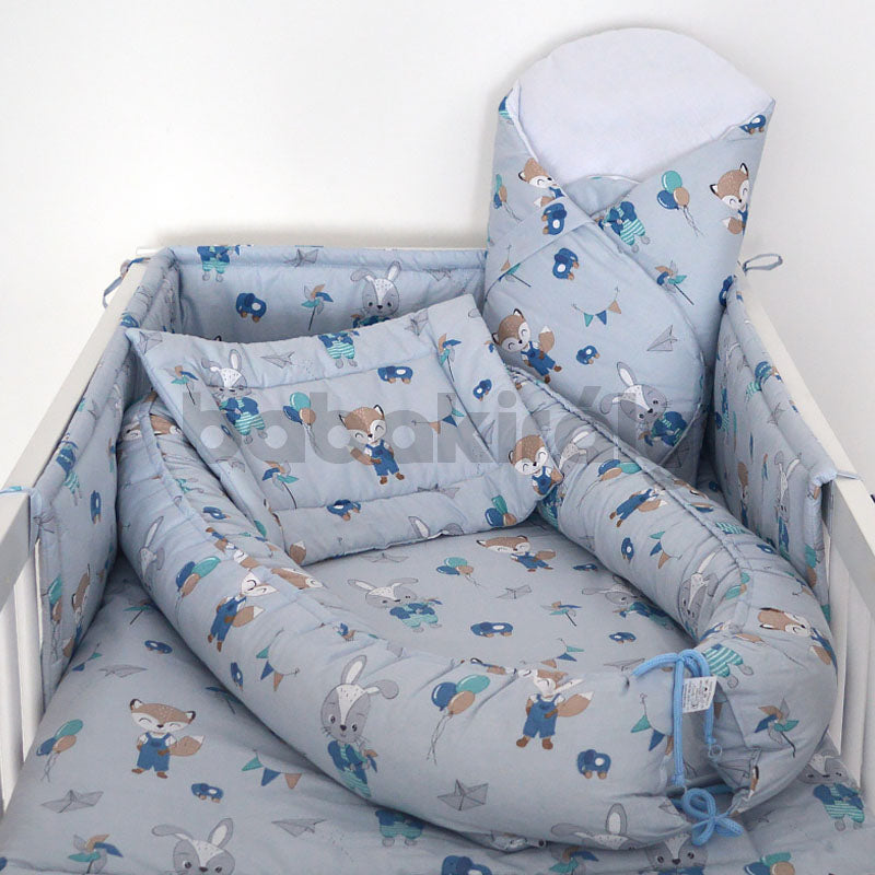 Ágynemű: Három részes (takaró + párna + fejvédő) mosható ágynemű szett, színes vidám mintákkal, az anyukák és a kisbabák legnagyobb örömére. Újszülött kortól ajánljuk. Méreteiből adódóan bármilyen babaágyban jól használható. A fejvédő óvja a már fejét emelgetni tudó babát az ággyal való ütközéstől, mely kötők segítségével erősíthető a kiságyhoz.