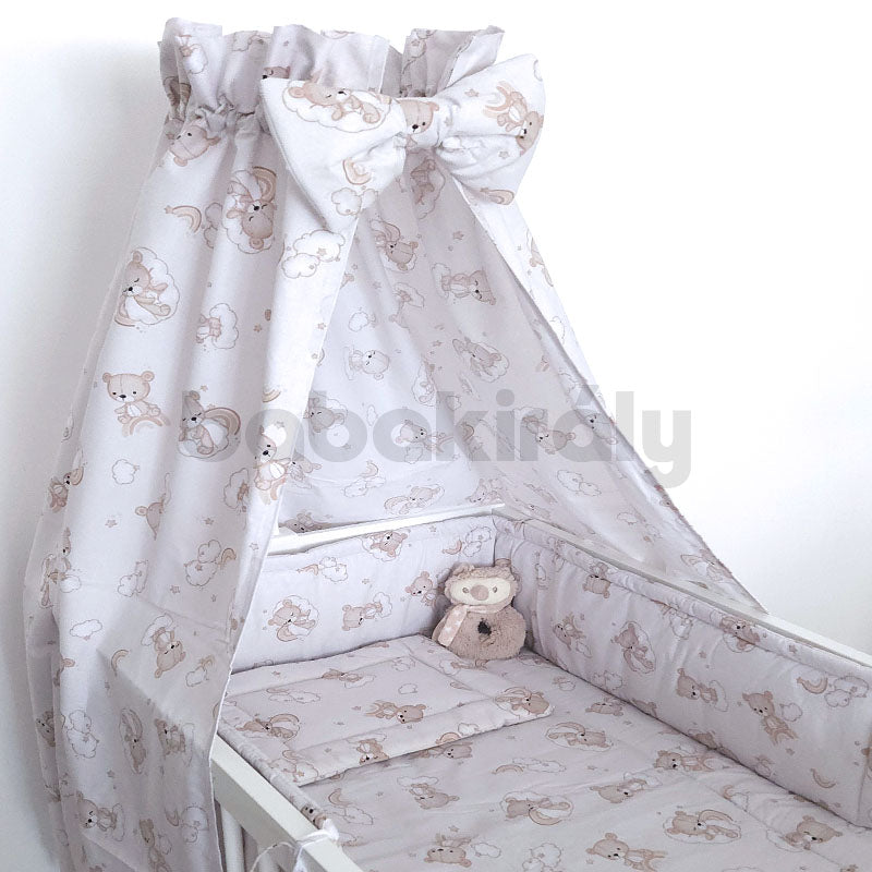 Négy részes (takaró + párna + fejvédő + baldachin függöny) mosható ágynemű szett, színes vidám mintákkal, az anyukák és a kisbabák legnagyobb örömére. A fejvédő óvja a már fejét emelgetni tudó babát az ággyal való ütközéstől, mely kötők segítségével erősíthető a kiságyhoz. A baldachinfüggöny öltözteti a babaszobát, csökkenti a beszűrődő fényeket így járul hozzá a baba nyugalmához. A függöny varrással kialakított résszel rendelkezik a baldachinvas számára, ami megkönnyíti az összeállítást. A díszítő masni egyszerűen, tépőzárral rögzíthető a tartóra. Nagy mérete lehetővé teszi a későbbi újrahasznosítást, átalakítást. Az ágyneművel azonos mintájú anyagból elérhető kókuszpólya és szoptatóspárna is.