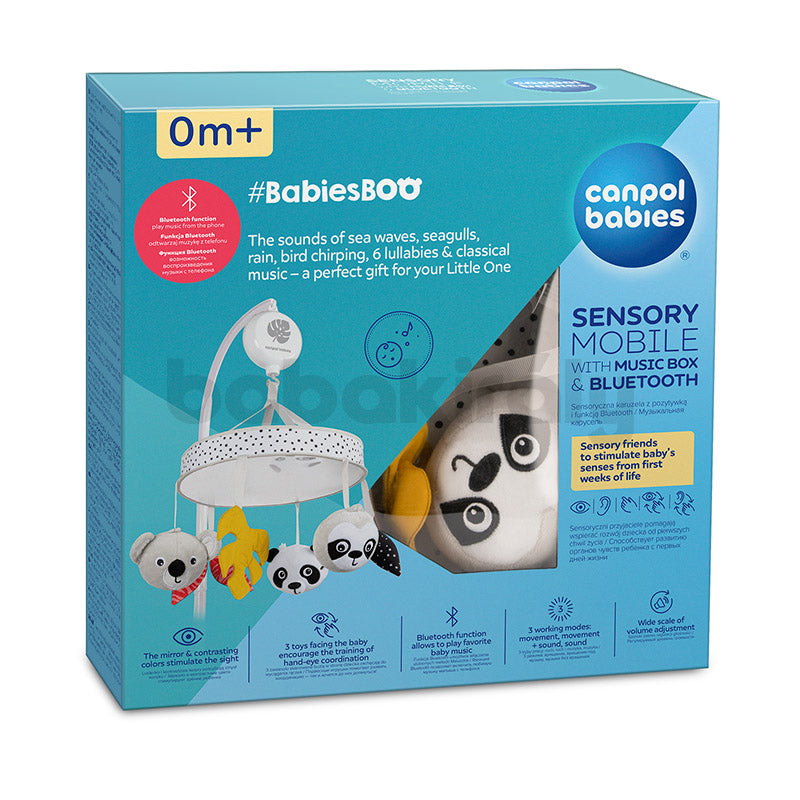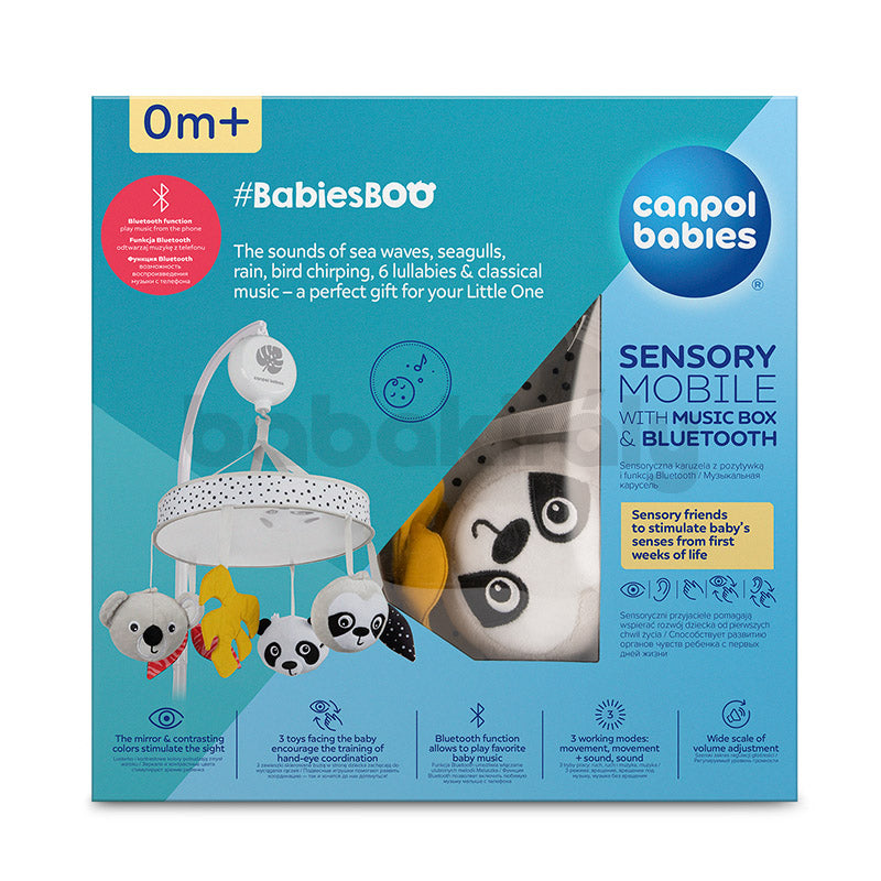 A Canpol babies szenzoros termék speciálisan profilozott fejpánttal rendelkezik, melynek köszönhetően könnyen és stabilan rögzíthető a babaágyra. A körhintán 6 különböző játék található, ebből 3 aranyos állat fejet mintáz. A kontrasztos színek - fehér és fekete, sárga és piros színnel kombinálva vonzzák a gyermek figyelmét és serkentik a képzeletét. Az alsó átmérő teljes felületén egy tükör található, amelyben a gyermek látja az arcát, felkeltve kíváncsiságát és érdeklődését. A forgóra szerelt lógó kiegészítők és a nagy tükör arra készteti a gyermeket, hogy kinyújtsa feléjük a kezét, ami támogatja az izomzat fejlődését, bevonja a látást és edzi a szem-kéz koordinációt. A Canpol babies forgó-zenélő játék szenzoros mobil zenedobozzal és Bluetooth BabiesBoo-val tökéletes ajándékötlet újszülötteknek vagy babaváró alkalmakra ajándékba.