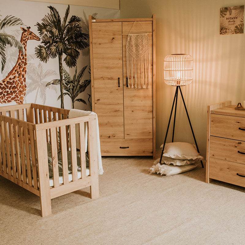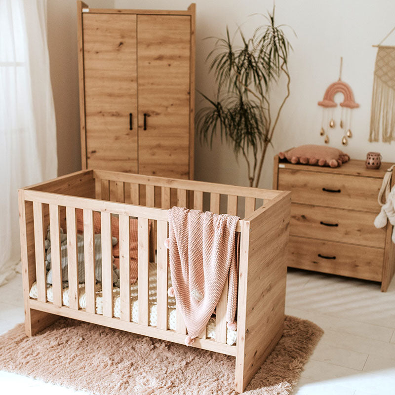 3 fokozatban állítható magasságú, kényelmes fekvő felületű kiságy, melyet mindig a gyermek korának megfelelően lehet beállítani. Kisebb korban a legmagasabb szinten, majd gyermekünk növekedésével párhuzamosan egyre lejjebb engedve ajánljuk használatát. Ez a szülőknek is rendkívül praktikus, mert nem szükséges nagyot hajolni a gyermek kivételekor. Legalacsonyabb fekvő pozíció esetén 2 kivehető rács oszlopának köszönhetően gyermeke önállóan elhagyhatja kiságyát. A csomag tartalmaz egy tölgy színű ágyneműtartót is, melyet a kiságy alá lehet helyezni.