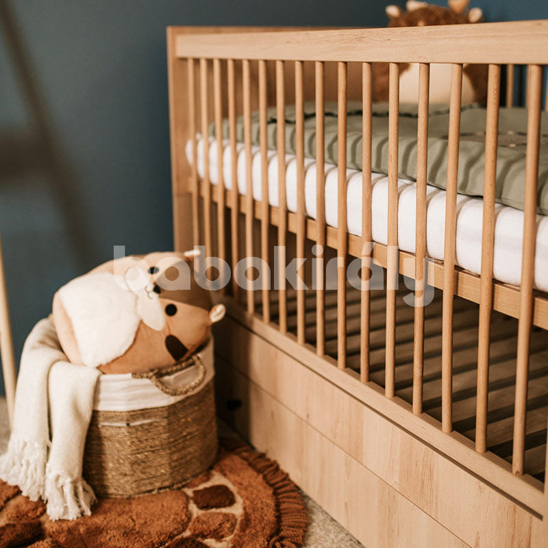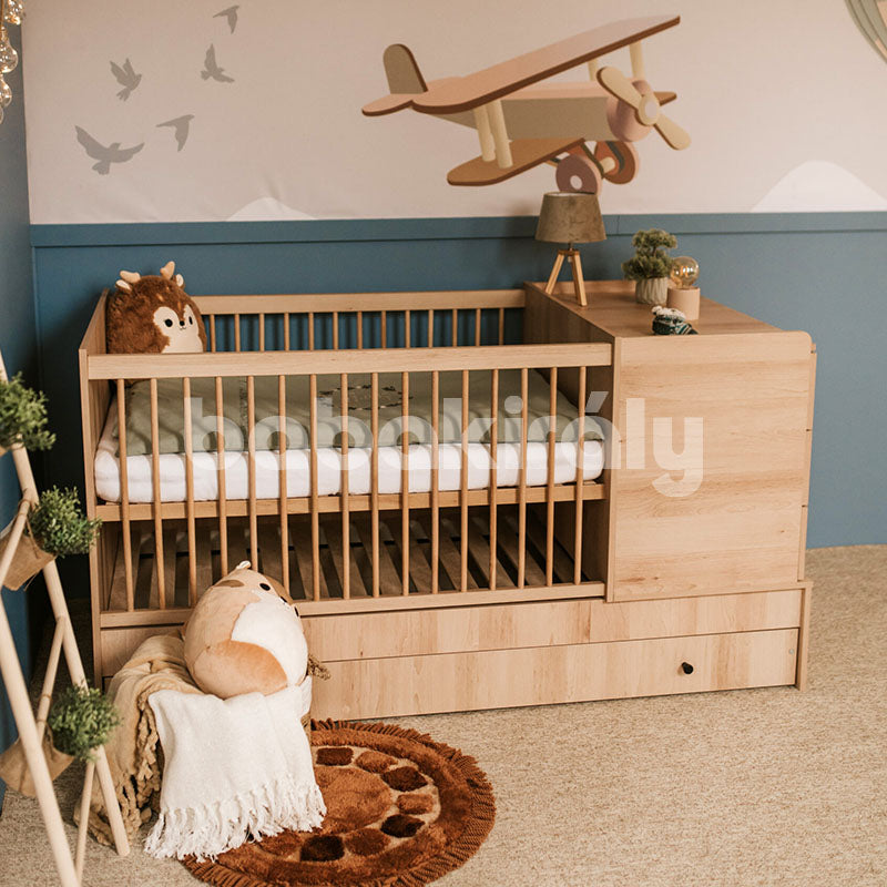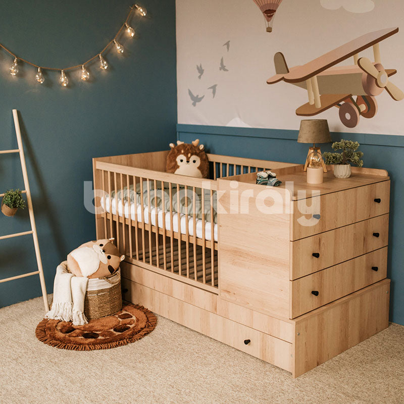 Praktikus és jól kihasználható 3 az 1-ben kombiágy. A komóddal ellátott kiságy a szétszerelést követően ifjúsági ágyként használható. A komód önálló bútordarabként is funkcionál, de a kiságy mellett hagyva segít az anyukáknak, hogy mindent egyszerűen elérjenek. 2 fokozatban állítható magasságú, kényelmes fekvő felülettel rendelkezik, amelyet mindig a gyermek korának megfelelően lehet beállítani. Kisebb korban a magasabb szinten, majd gyermekünk növekedésével párhuzamosan lejjebb engedve ajánljuk használatát. 2 kivehető rács oszlopának köszönhetően gyermeke önállóan elhagyhatja kiságyát.