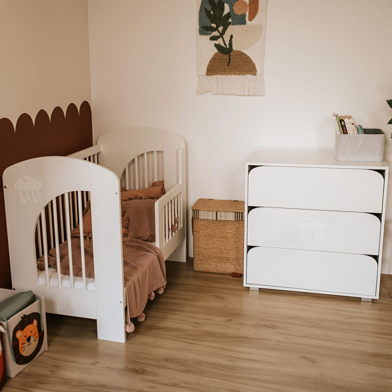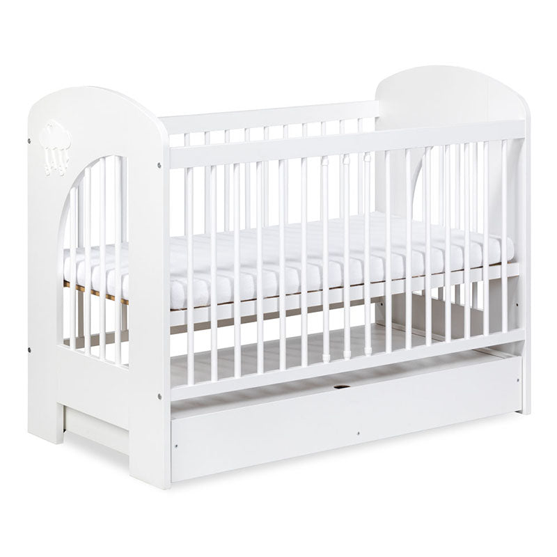 3 fokozatban állítható magasságú, kényelmes fekvő felületű kiságy, melyet mindig a gyermek korának megfelelően lehet beállítani. A 3 fokozat 41, 31 és 21 cm-re helyezkedik el a padlótól mérve. Kisebb korban a legmagasabb szinten, majd gyermekünk növekedésével párhuzamosan egyre lejjebb engedve ajánljuk használatát. Ez a szülőknek is rendkívül praktikus, mert nem szükséges nagyot hajolni a gyermek kivételekor. Legalacsonyabb fekvő pozíció esetén 3 kivehető rács oszlopának köszönhetően gyermeke önállóan elhagyhatja kiságyát. A csomag tartalmaz egy fehér színű ágyneműtartót is, melyet a kiságy alá lehet helyezni.