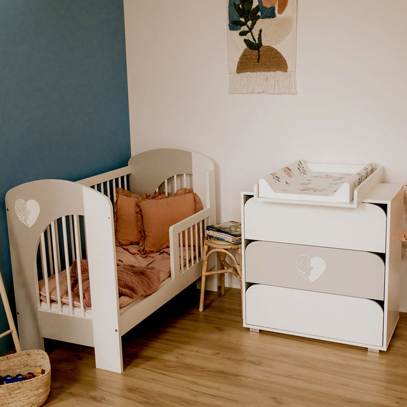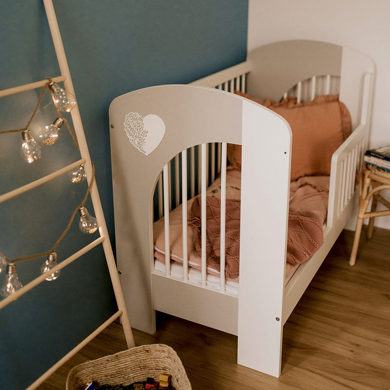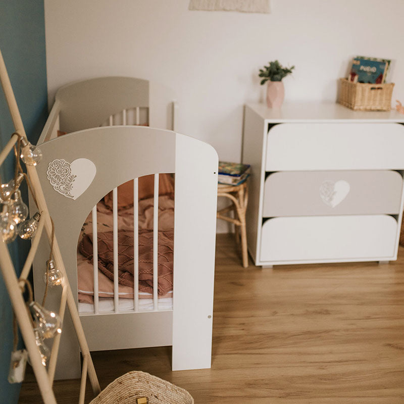 3 fokozatban állítható magasságú, kényelmes fekvő felületű kiságy, melyet mindig a gyermek korának megfelelően lehet beállítani. A 3 fokozat 41, 31 és 21 cm-re helyezkedik el a padlótól mérve. Kisebb korban a legmagasabb szinten, majd gyermekünk növekedésével párhuzamosan egyre lejjebb engedve ajánljuk használatát. Ez a szülőknek is rendkívül praktikus, mert nem szükséges nagyot hajolni a gyermek kivételekor. Legalacsonyabb fekvő pozíció esetén 3 kivehető rács oszlopának köszönhetően gyermeke önállóan elhagyhatja kiságyát. A csomag tartalmaz egy fehér színű ágyneműtartót is, melyet a kiságy alá lehet helyezni.