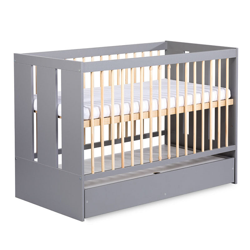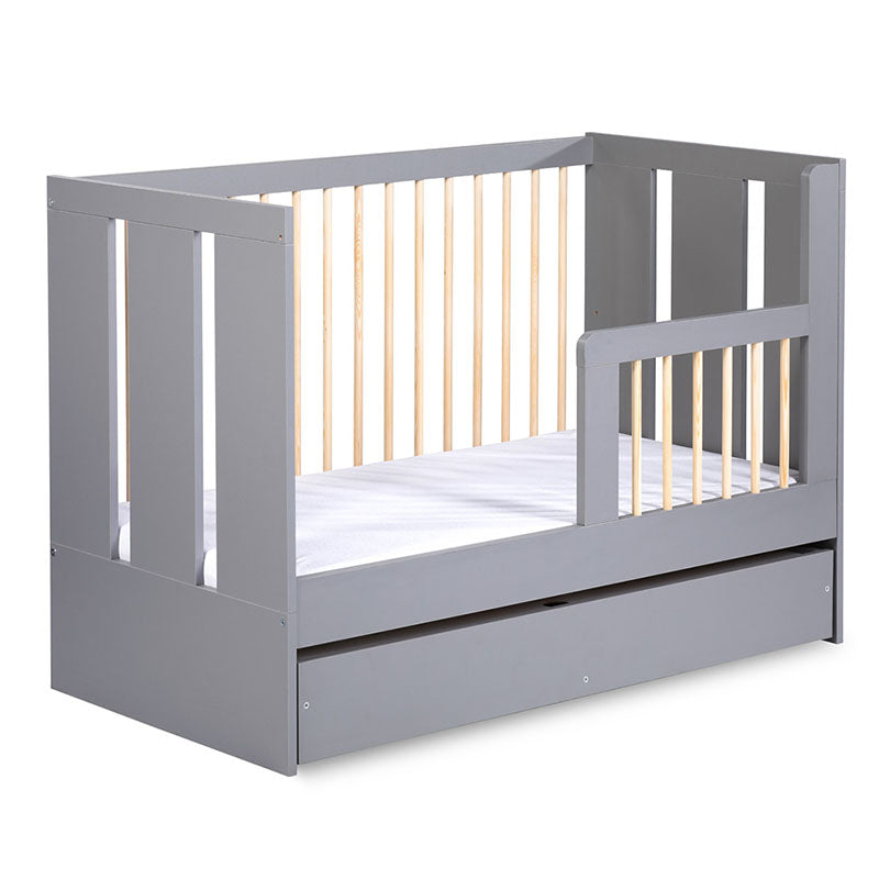 3 fokozatban állítható magasságú, kényelmes fekvő felületű kiságy, melyet mindig a gyermek korának megfelelően lehet beállítani. Kisebb korban a legmagasabb szinten, majd gyermekünk növekedésével párhuzamosan egyre lejjebb engedve ajánljuk használatát. Ez a szülőknek is rendkívül praktikus, mert nem szükséges nagyot hajolni a gyermek kivételekor. Legalacsonyabb fekvő pozíció esetén 3 kivehető rács oszlopának köszönhetően gyermeke önállóan elhagyhatja kiságyát. A rácsos oldal leszerelését követően leesésgátlóval felszerelhető, így alvás közben védelmet nyújt a már óvodás gyermekek számára is. A csomag tartalmaz egy grafit színű ágyneműtartót is, melyet a kiságy alá lehet helyezni.