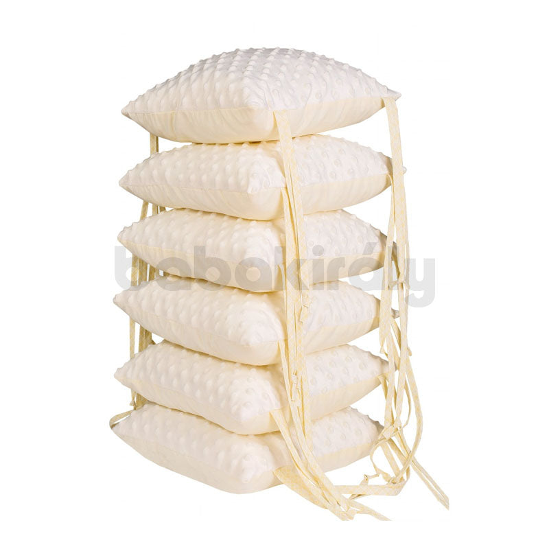 Puha, mosható kispárnákból álló fejvédő, vidám színű minky (buborékos) anyagból. Újszülött kortól ajánljuk. Méreteiből adódóan bármilyen babaágyban jól használható.