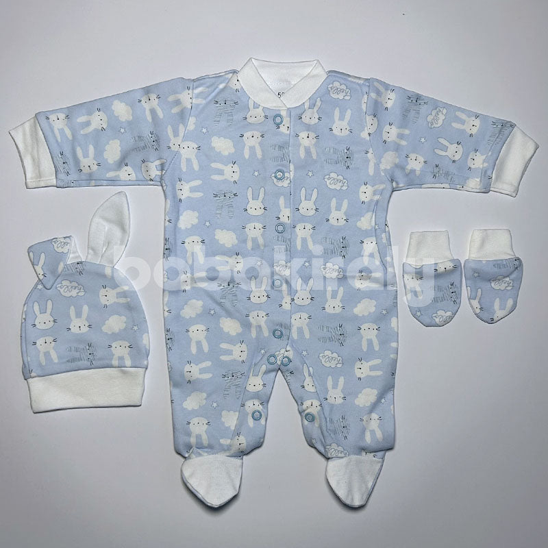 Vidám mintás anyagból készült pamut 3 részes hazahozós szett. Vékony és puha anyagának köszönhetően a melegebb időkben ideális választás. Kellemes, puha és minőségi anyagból készült. A hazahozós szettek olyan kisgyermekek számára készült ruhadarabok, amelyeket a baba kórházból való hazahozatalára tervezték.