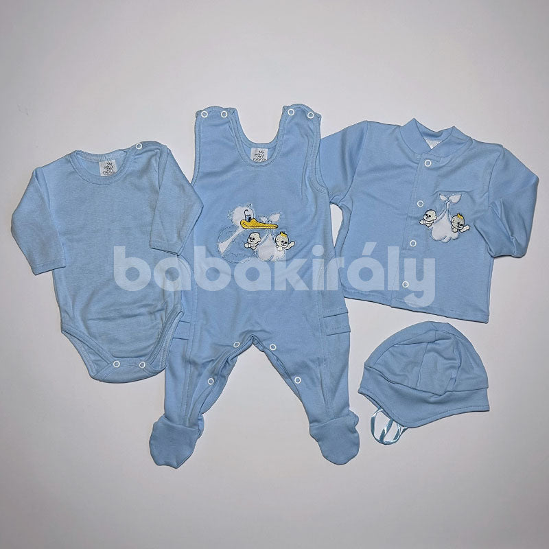 Vidám gólyás hímzéssel díszített interlock pamut 4 részes hazahozós szett. Vékony és puha anyagának köszönhetően a melegebb időkben ideális választás. Kellemes, puha és minőségi anyagból készült. A hazahozós szettek olyan kisgyermekek számára készült ruhadarabok, amelyeket a baba kórházból való hazahozatalára tervezték.
