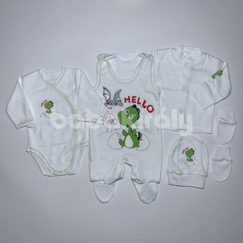 Vidám filmnyomással díszített interlock pamut 5 részes hazahozós szett. Vékony és puha anyagának köszönhetően a melegebb időkben ideális választás. Kellemes, puha és minőségi anyagból készült. A hazahozós szettek olyan kisgyermekek számára készült ruhadarabok, amelyeket a baba kórházból való hazahozatalára tervezték.