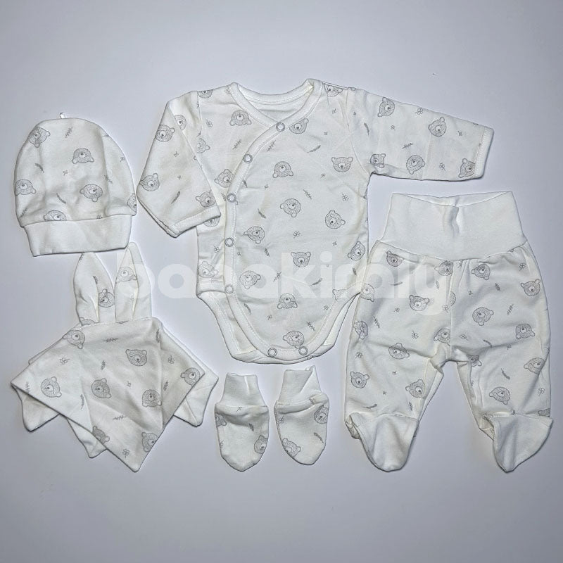 Vidám mintás anyagból készült pamut 5 részes hazahozós szett. Vékony és puha anyagának köszönhetően a melegebb időkben ideális választás. Kellemes, puha és minőségi anyagból készült. A hazahozós szettek olyan kisgyermekek számára készült ruhadarabok, amelyeket a baba kórházból való hazahozatalára tervezték.