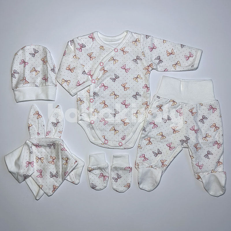 Vidám mintás anyagból készült pamut 5 részes hazahozós szett. Vékony és puha anyagának köszönhetően a melegebb időkben ideális választás. Kellemes, puha és minőségi anyagból készült. A hazahozós szettek olyan kisgyermekek számára készült ruhadarabok, amelyeket a baba kórházból való hazahozatalára tervezték.